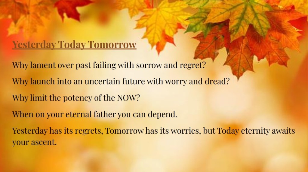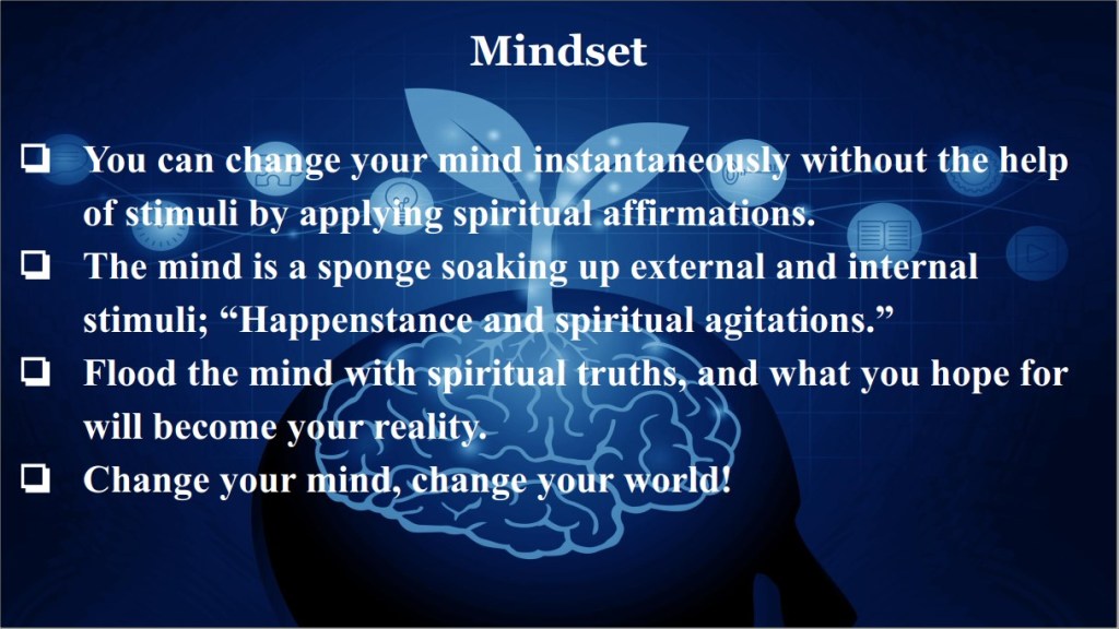 This mentality or spiritual beingness; that is taking on the attitude I want to inculcate in myself is a surefire way to rid my soul of despair and anxiety — for example, I clothe myself in a spirit of optimism and serenity instead of depression and worry.